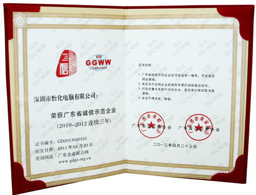怡化連續三年榮獲廣東省誠信示范企業