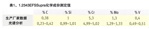 表1所列除了三種材料號為1.2343,1.2344、1.2367常用熱工鋼的化學成分,還列了特種材料為TQ、HP及HTR熱工鋼的化學成分。在所有情況下,涉及的是主要合金元素為鉻、鉬及釩的馬氏體熱工鋼;主要合金元素是以電解再熔工藝(ESU)生產的。