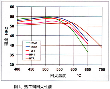 圖表不僅是壓鑄模具熱處理時一個重要的工作方法,而且也對熱工鋼正確選擇有幫助。這樣的圖表明的是由于加熱鋼的硬度變化。圖1,是所介紹鋼的回火曲線,在此曲線圖上,德國使用較少的1.2344鋼未列上去。除了HTR鋼,所列鋼種在500——550度之間回火溫度下表現有顯明的二次硬度最大值。隨著回火溫度繼續增加,硬度下降。由曲線下降坡度可以推斷回火穩定性。回火曲線下降越陡,鋼的回火穩定性越小,在澆注作業中鋼的加熱反應越敏感。與1.2343鋼相比,此曲線證明1.2367鋼有較好的回火穩定性,在550度之上回火溫度技術范圍,TQ1和HP1達到幾乎與1.2367一樣的回火穩定性。特種鋼HTR由于其高的鎢含量表現出較其余鋼明顯高的回火溫度。二次硬度最大值不僅在約70度時移至較高的回火溫度,在此最大值之上溫度時曲線也降得比較小。